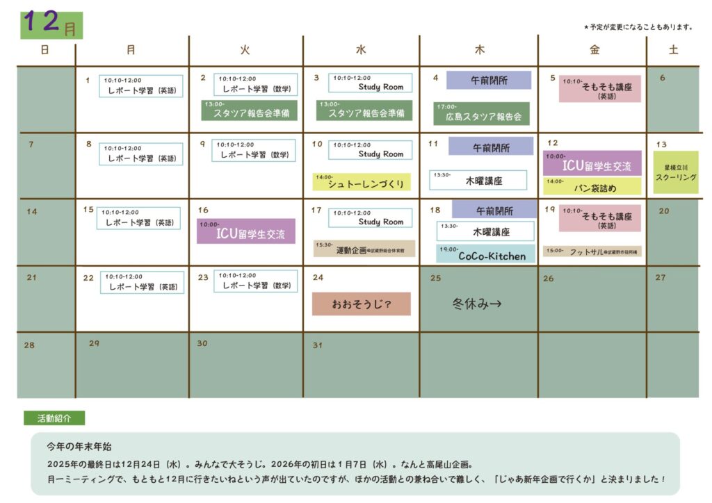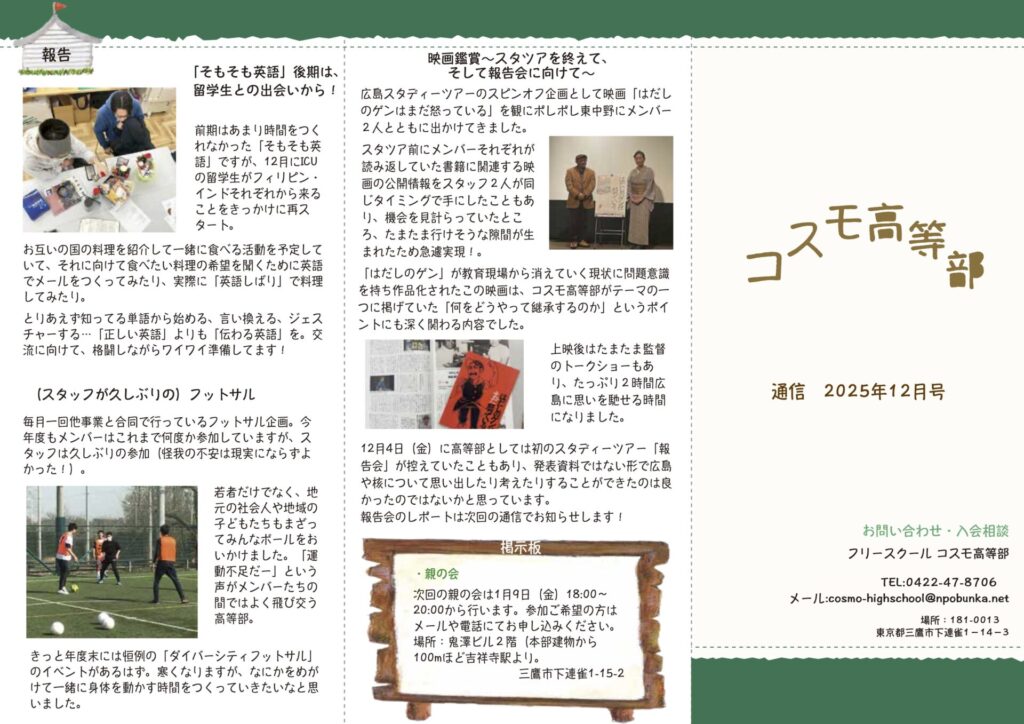 12月号通信を発行しましたお知らせ 2025年12月12日あっという間に年の瀬です…(あっという間すぎて、11月の通信をアップ出来ておらず申し訳ありません)春を見据えて準備を始めるメンバーがいたり、レポートに追われるメンバーがいたりしながらも、プログラムが思いのほか詰まった1ヶ月になりそうです。\ シェアしてね! ⁄タグ:サポート校スケジュール中退少人数居場所星槎国際高等学校通信制高卒認定高校高等学校コスモ便り一覧